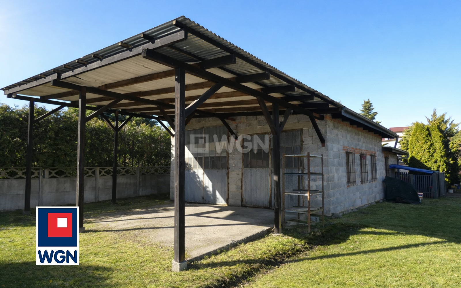 Na działce znajduje się murowany budynek gospodarczo-garażowy wraz z wiatą o powierzchni około 58 mkw, wymagający remontu.