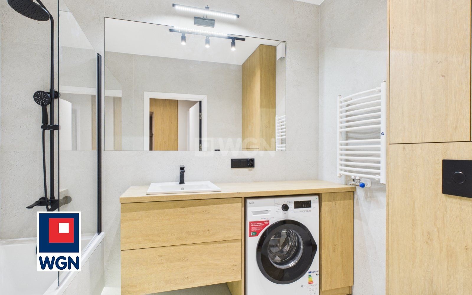 - Elegancka łazienka wykończona wysokiej klasy kaflami, z wanną i pralką automatyczną